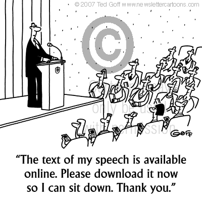 Management Cartoon # 5755: The text of my speech is available online. Please download it now so I can sit down. Thank you.