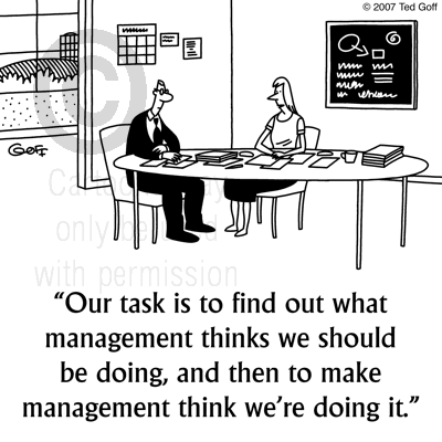 Management Cartoon # 5681: Our task is to find out what management thinks we should be doing and then to make management think we re doing it.