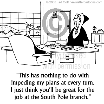 Management Cartoon # 5742: This has nothing to do with impeding my plans at every turn. I just think you ll be great for the job at the South Pole branch.