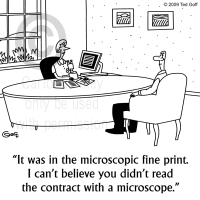 Topics: 6303 business "It was in the microscopic fine print. I can't believe you didn't read the contract with a microscope." office financial legal clause