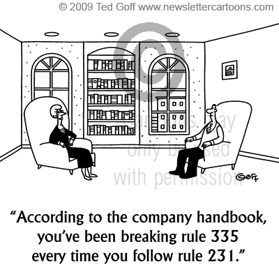 Management Cartoon # 6333: According to the company handbook, you've been breaking rul 335 every time you follow rule 231.