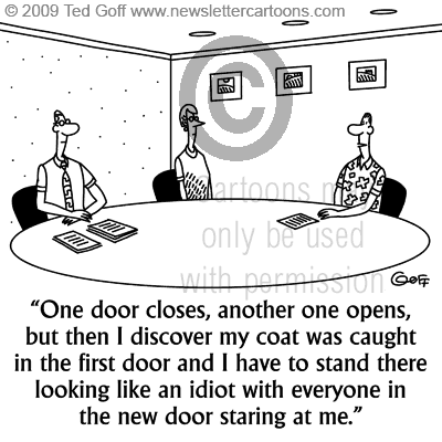 Topics: 6335 business "One door closes, another one opens, but then I discover my coat was caught in the first door and I have to stand there looking like an idiot with everyone in the new door staring at me." general opportunity cliche