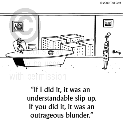 Office Cartoon # 6337: If I did it, it was an understandable slip up. If you did it, it was an outrageous blunder.