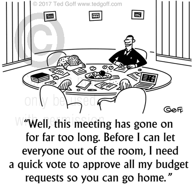 Management Cartoon # 7712: Well, this meeting has gone on for far too long. Before I can let everyone out of the room, I need a quick vote to approve all my budget requests so you can go home.