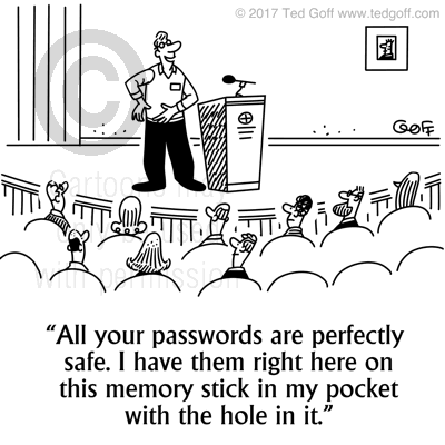 Computer Cartoon # 7722: All your passwords are perfectly safe. I have them right here on this memory stick in my pocket with the hole in it.